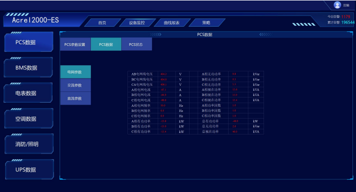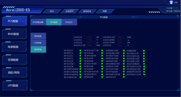 采集并顯示 PCS 系統(tǒng)的相關(guān)參數(shù),包括:直流側(cè)的電壓/電流/功率等、PCS 的三相有功功率、無功功率、三相電壓、三相電流、功率因素、頻率、運(yùn)行狀態(tài)、報(bào)警及故障信息等常用信息,及日輸入電量、日輸出電量、累計(jì)輸入電量、累計(jì)輸出電量等;