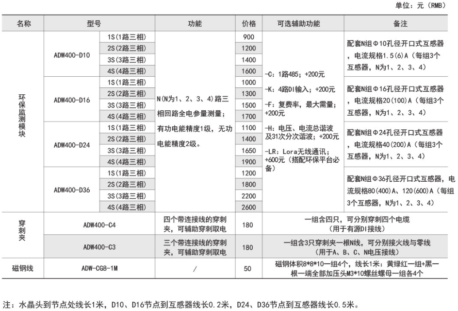 ADW400環(huán)保監(jiān)測模塊主要用于計量低壓網絡的三相有功電能,同時可選擇四個回路的電流輸入,具有RS485通訊和470MHz無線通訊功能,方便用戶進行用電監(jiān)測、集抄和管理。可靈活安裝于配電箱內,實現對不同區(qū)域和不同負荷的分項電能計量,統(tǒng)計和分析。
