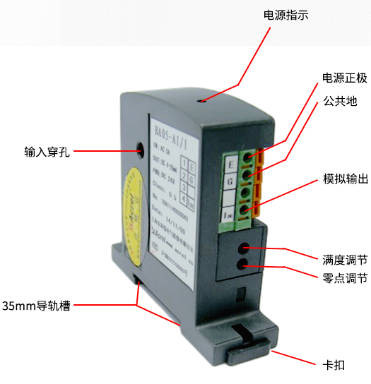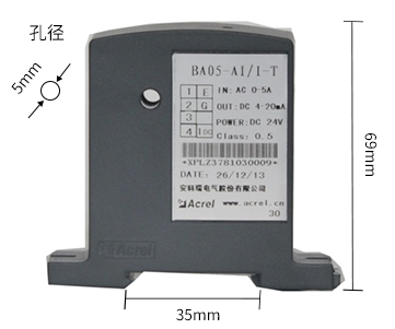 | BA05-AI/I(V) | 對(duì)交流0-10A電流信號(hào)采集,隔離變送輸出4-20mA或0-5V DC信號(hào) | Φ5 | AC0~(0.5~10)A |