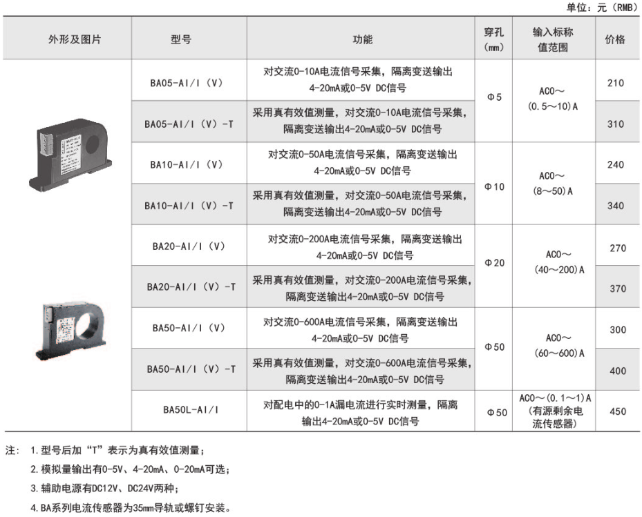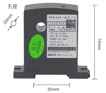| BA10-AI/I(V) | 對(duì)交流0-50A電流信號(hào)采集,隔離變送輸出4-20mA或0-5V DC信號(hào) | Φ10 | AC0~(8~50)A |