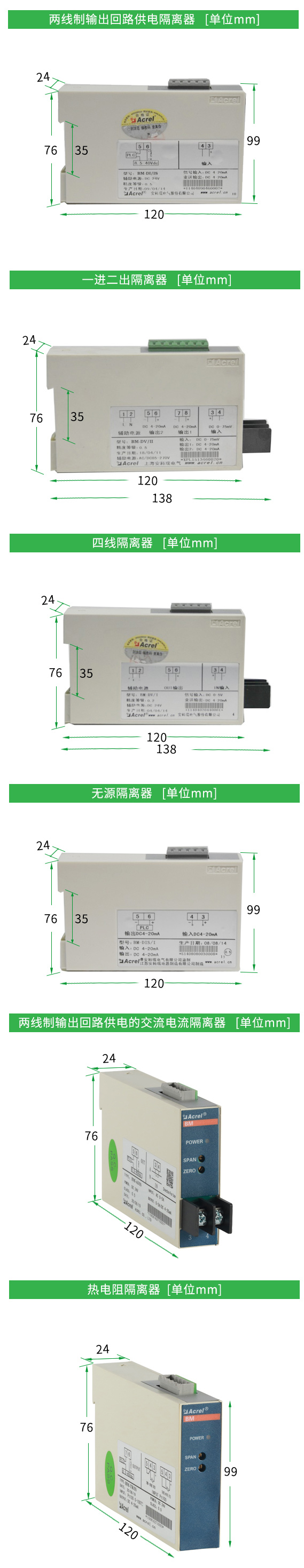 安科瑞B(yǎng)M系列模擬信號隔離器可以對電流、電壓等電量參數(shù)或溫度、電阻等非電量參數(shù)進(jìn)行高速精確測量,經(jīng)隔離轉(zhuǎn)換成標(biāo)準(zhǔn)的模擬信號輸出。既可直接與指針表、數(shù)顯表相接,也可以與自控儀表(如PLC)、各種A/D轉(zhuǎn)換器以及計(jì)算機(jī)系統(tǒng)配接。